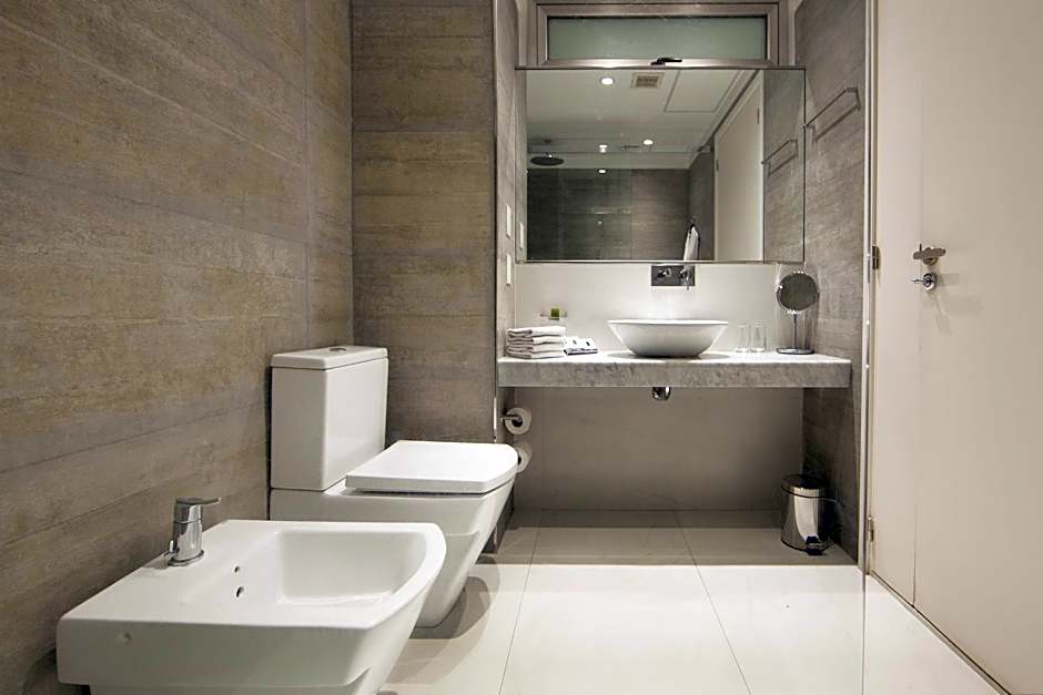 This suite features views of the Palermo skyline, 1 large bedroom with an private bathroom with a bath tub, and a living room with a dining area, design furniture and a toilet.