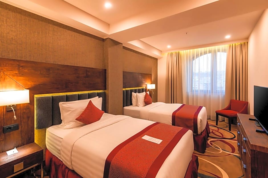 The Ramada Hotel & Suites by Wyndham Yerevan offers a variety of rooms, including Family Suites, Queen Rooms for single occupancy, Superior Suites, Twin Rooms, Junior King Suites, King Rooms, Two-Bedroom Presidential Suites, King Rooms with Mobility Access, Two-Bedroom Superior Suites, Deluxe King Suites, King Suites, and Junior Twin Suites. These rooms range in size from 205 sqft to 1163 sqft and accommodate between 1 and 4 adults, with additional space for children. All rooms have non-smoking policies and feature different bed configurations, including twin beds and king size beds.