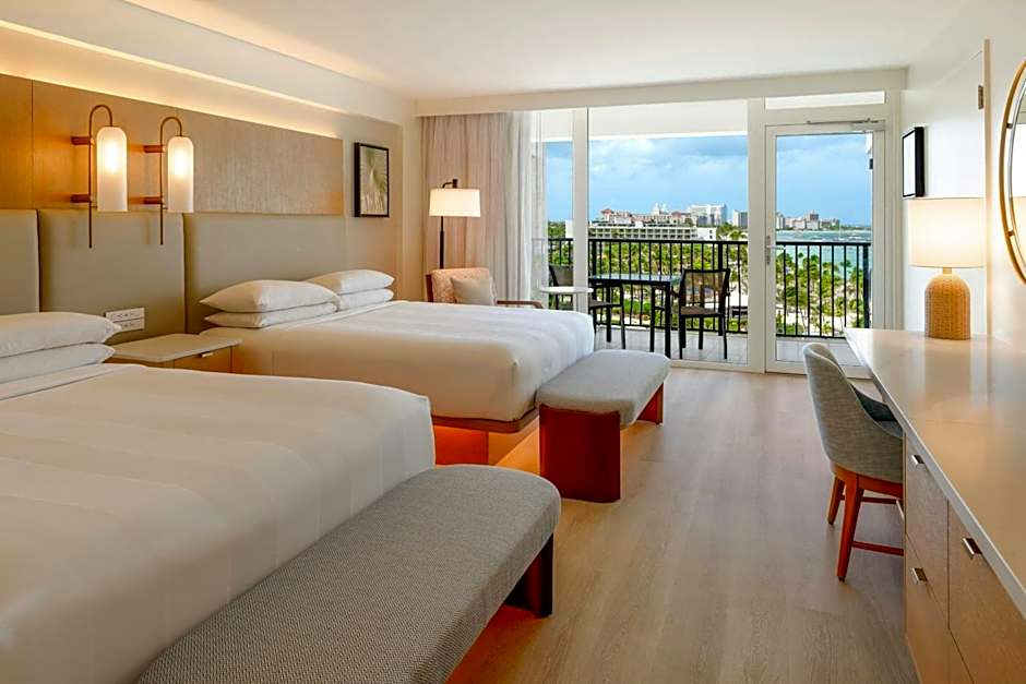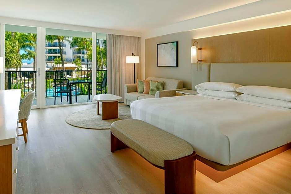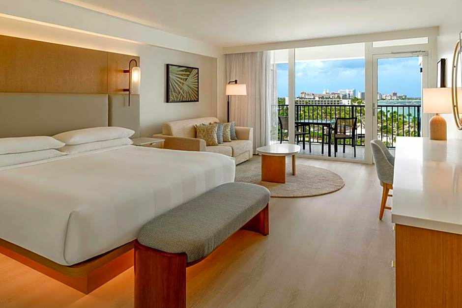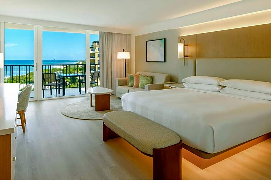 This Tradewinds room comes with 1 king-size Marriott Revive beds and a large private balcony with ocean views. It has a 37-inch LCD TV, a mini-fridge and a coffee maker. The contemporary bathroom features a double sink, Aveda toiletries and a free bathrobe. Guest will also be able to enjoy complimentary full American breakfast and lunch, plus free hors d'oeuvres, mid-day snack, dessert and all non alcoholic drinks. Cocktails from 18:00 to 21:00 daily are included. This type of room is located in the Club Floor, offers a private lounge, concierge services, special private beach area, reserved parking space, tea and coffee service from 15:00 to 17:00 hours and spa treatments for a fee.