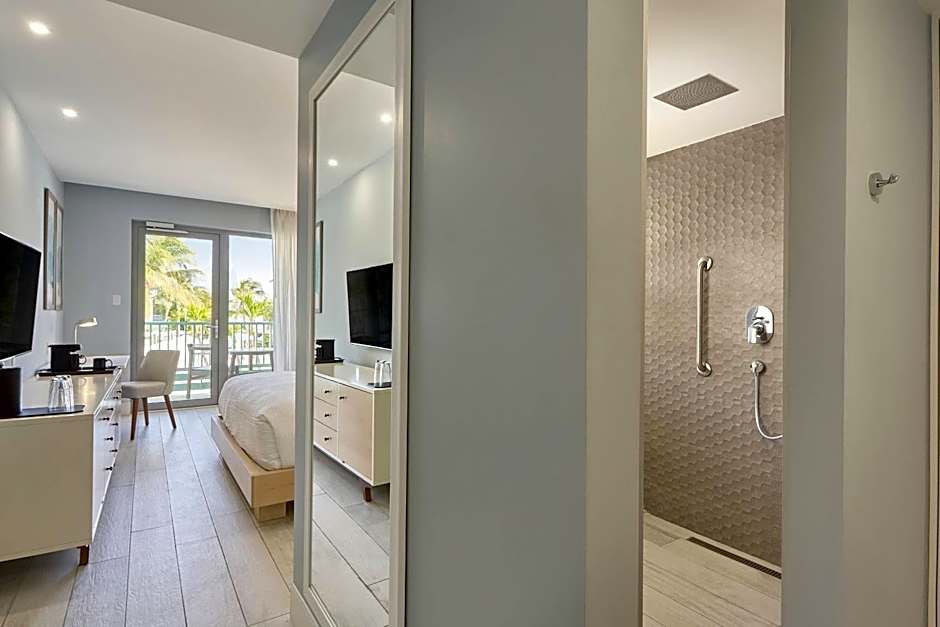 This room features dual sink vanity, shower with rain shower and tiled floors. It provides amenities such as microwave, individually controlled air conditioning, clock radio, hairdryer, iron/ironing board, mini-cooler fridge, free WiFi, ample power outlets, sitting area, 55-inch TV and blackout shades.