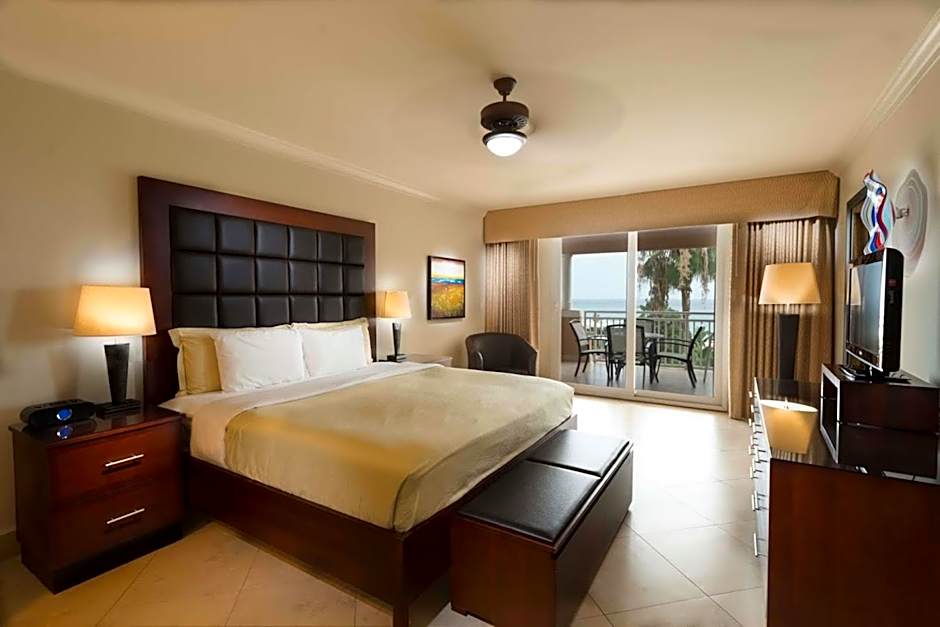 This suite features a king-size bed and a queen sleeper sofa in the separate living area. The suite also offers a fully equipped kitchen and a private patio or balcony.