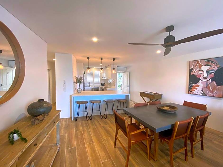 This apartment includes a master bedroom with en suite and a second bathroom with a shower and a bath. There is also additional toilet facilities. It features a beachfront courtyard and a renovated, spacious living area. A fully-equipped kitchen and laundry facilities are also featured and the apartment has direct access to Byron Bay Main Beach.