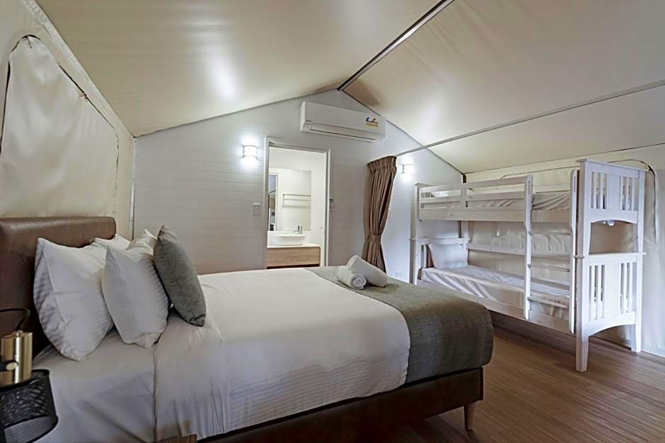 Discovery Parks - Byron Bay offers a variety of accommodation options including cabins, studios, villas, and safari tents. Occupancy ranges from 2 to 6 guests per room, with both smoking and non-smoking rooms available. Guests can enjoy different bed sizes such as king, queen, double, and single beds, along with room sizes suitable for couples, families, or larger groups.