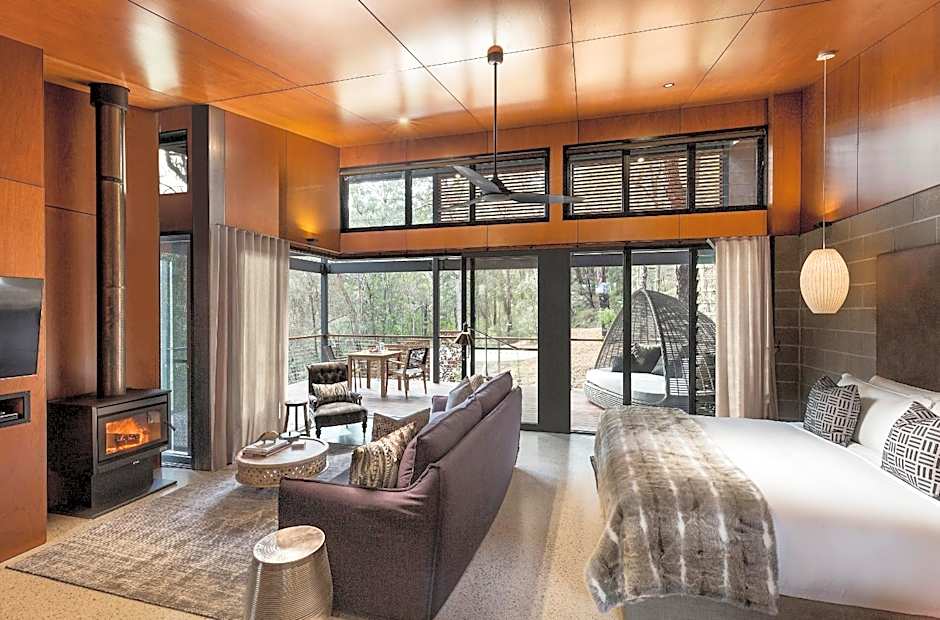 The Lodge Suite is nestled among the property's bushland and native gardens. This suite is ideally located in the main lodge. It provides direct access to the main dining and lounge areas. This suite features a gas fireplace, open plan bathroom with a bathtub and rain shower and underground floor heating.
