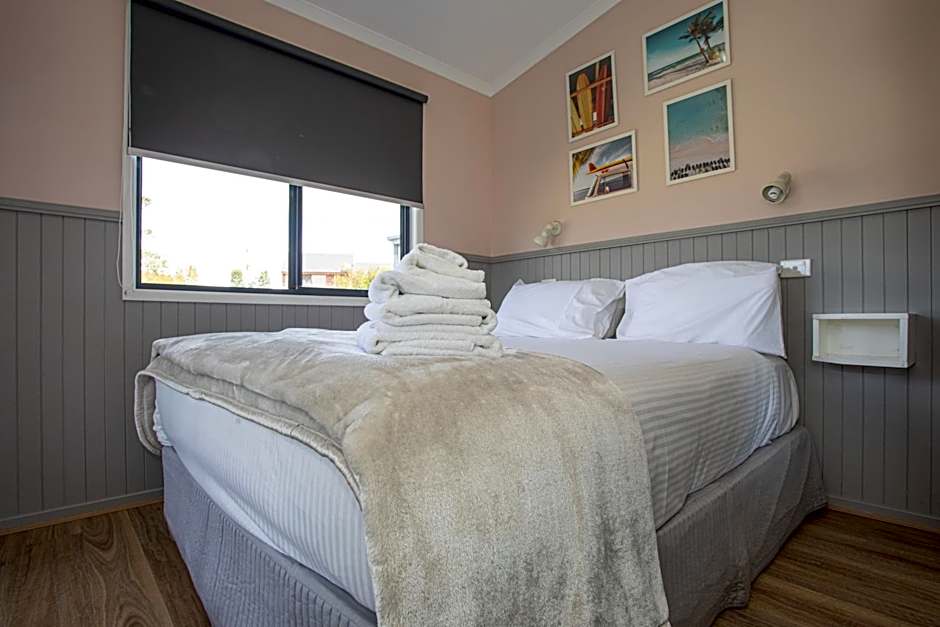 Great location right on the water and park reserve with playground across the street and jetty’s for fishing. Lovely cafe next door for breakfast and lunch at Pelican Rocks Cafe. Lovely BBQ area and grassy open spaces for the dogs and kids to run around on outside the cabins. Multiple fire pits around the property are a great idea. A great location all round, especially for dog owners and great for kids too.