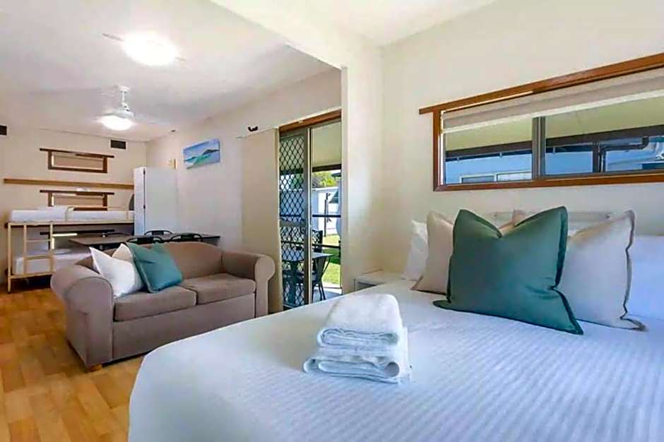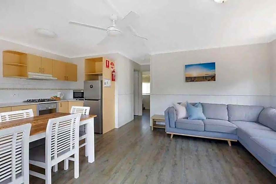 location was fantastic. 250m from ocean, 500m to an Iga, and a pub across the road. huge cabin which was very clean and tidy, aircon already cooling on arrival, friendly staff, very dog friendly, leash free area within grounds well maintained.