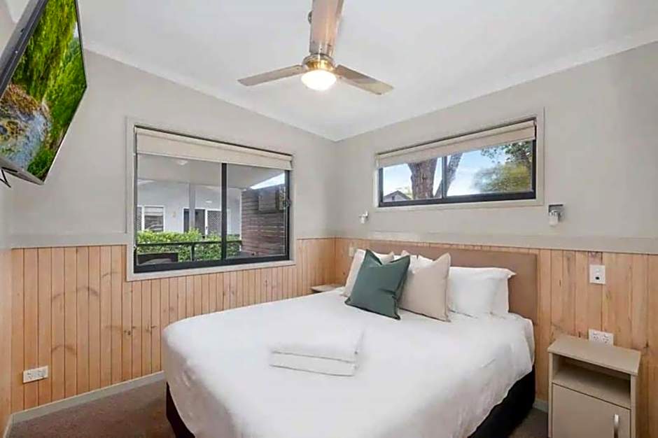Pet friendly so could take our dog. The 2 bedroom cabin was spotless and sensibly furnished for pet-friendly. The balcony was large and especially helpful given it poured rain most of the time. Having the pub across the road was handy for takeaway pizza. We also enjoyed lunch in their dog-friendly outdoor section. The staff at the park were friendly. There was an off leash area our dog could run around in and dog waste bag stations around the park.