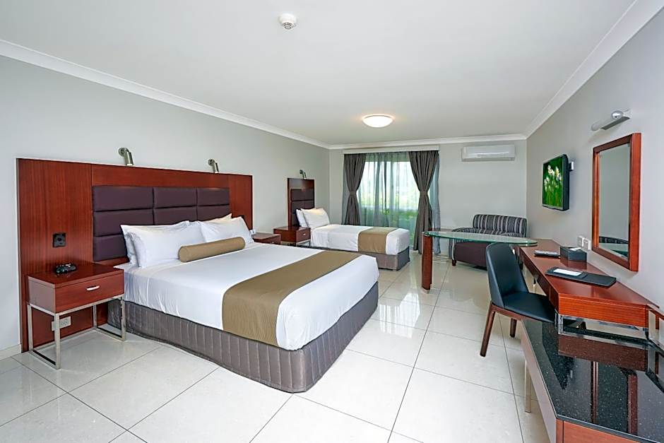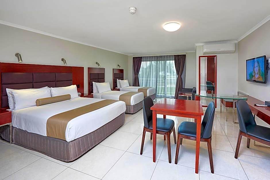 The Best Western Casula Motor Inn offers a variety of room types, including Executive Studio Apartments, Deluxe Family Rooms, Deluxe Twin Rooms, Deluxe Queen Rooms with Disability Access, and Deluxe Queen Rooms. All rooms have a non-smoking policy and vary in size from 291 sqft to 592 sqft. Most rooms accommodate 3 adults and 2 children, and bed options include twin beds and queen size beds.