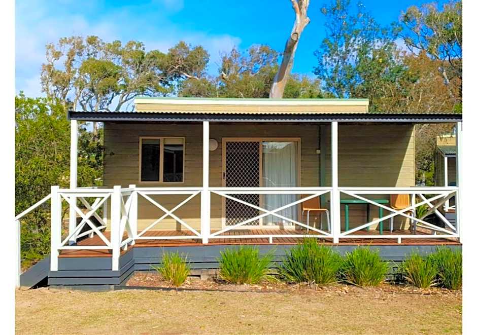These cabins include a kitchenette, TV, electric heating and an private bathroom. All cabins have a small covered patio with a dining table and chairs. Each cabin has a double bed in the master bedroom and a bunk bud adjacent to the living room and day bed in lounge room. All linen is provided.
