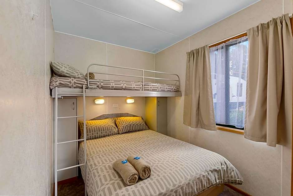 Perfect location. Within walking distance to town. Quiet for a caravan park. Friendly accommodating staff and the cabin was well insulated and warm. There was plenty of room to move around. Not only a microwave but a lovely fridge. gas cook top and an oven.