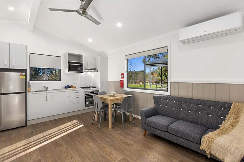The cabin was basic but cosy and clean. My friend and I spent Christmas together there. We had such a lovely relaxed Christmas. I particularly liked the balcony. We had a few brunches and afternoon snacks on it. It was a quite, calm location despite being near the Hume Highway. The bed was comfortable and the shower was very powerful There are lovely walking tracks close by. Take along your walking shoes! I also loves waking up to the birdlife around the camp ground. The staff were super friendly.