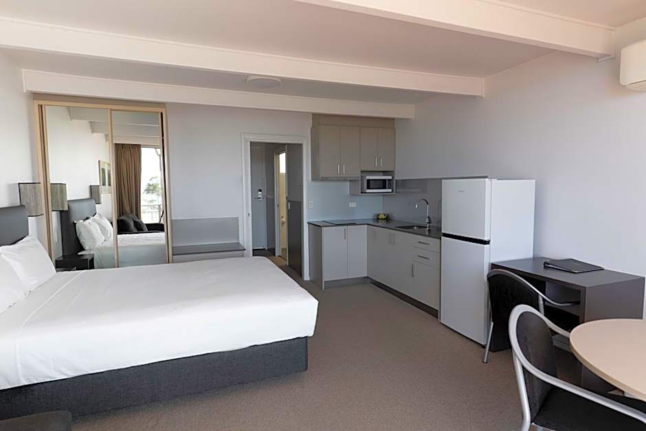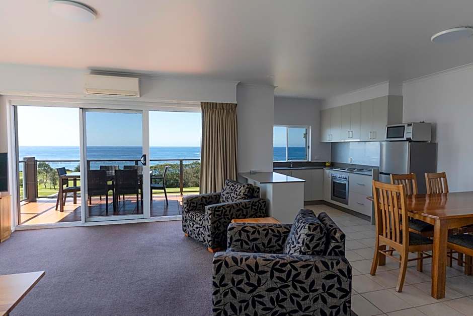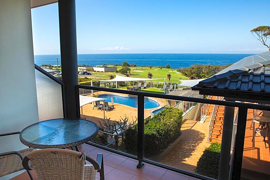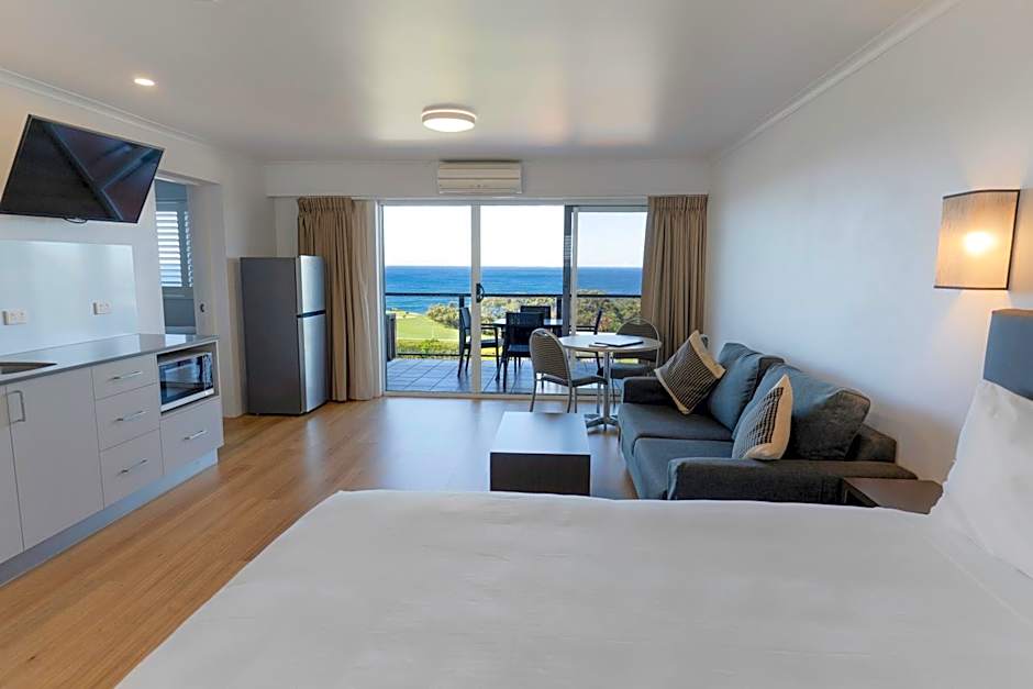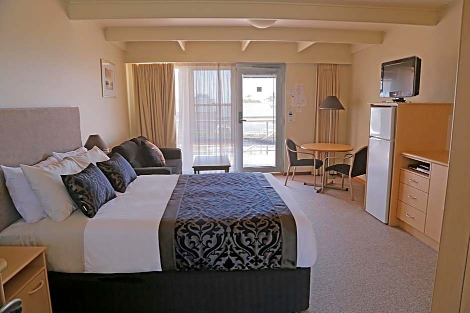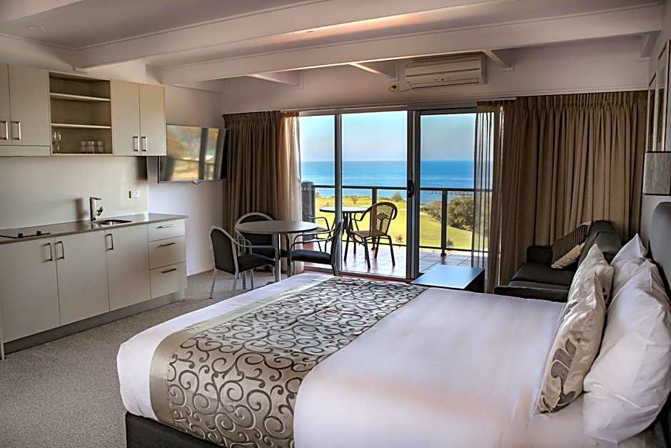 Located about 3km from CBD and local shopping centre. Unless you like lots of hills, don't consider to be within walking distance of main part of the town. Across the road from Golf Course (great Bistro) and great coastal views. Room was very clean and spacious and bed very comfortable. Nice verandah/balcony looking over the pool area and a lovely sunny spot in the mornings to relax.