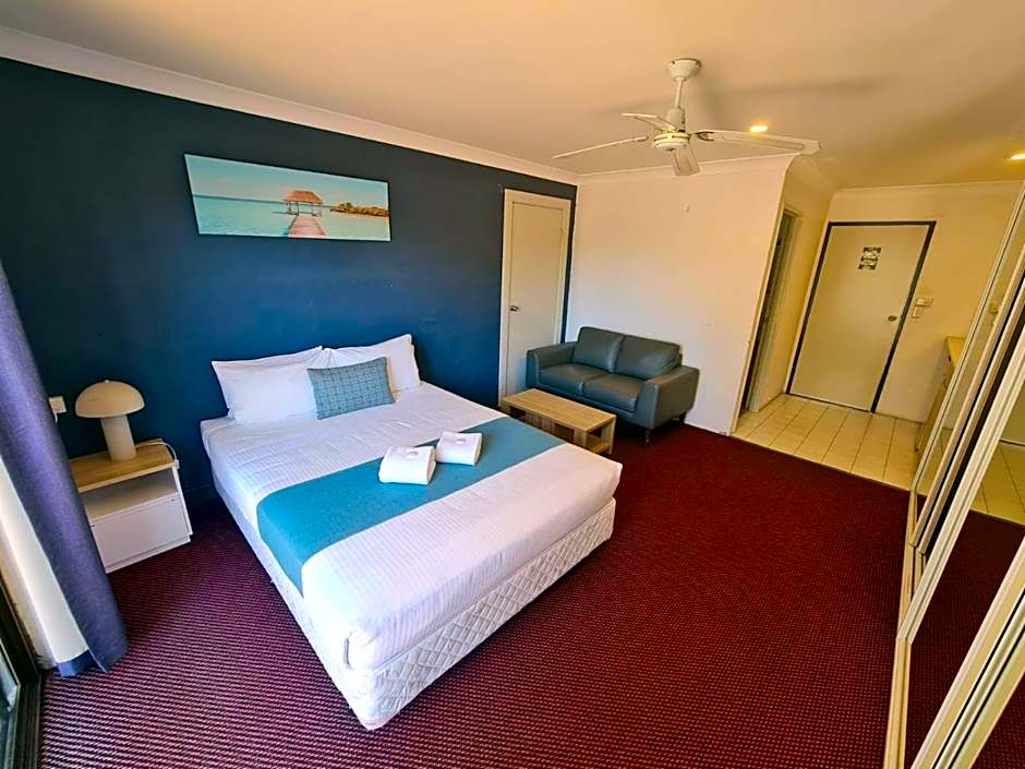 The Standard Queen Twin room features a queen bed and single bed, along with a kitchenette offering a bar fridge, toaster and kettle. There is an private bathroom, ceiling fans and TV.