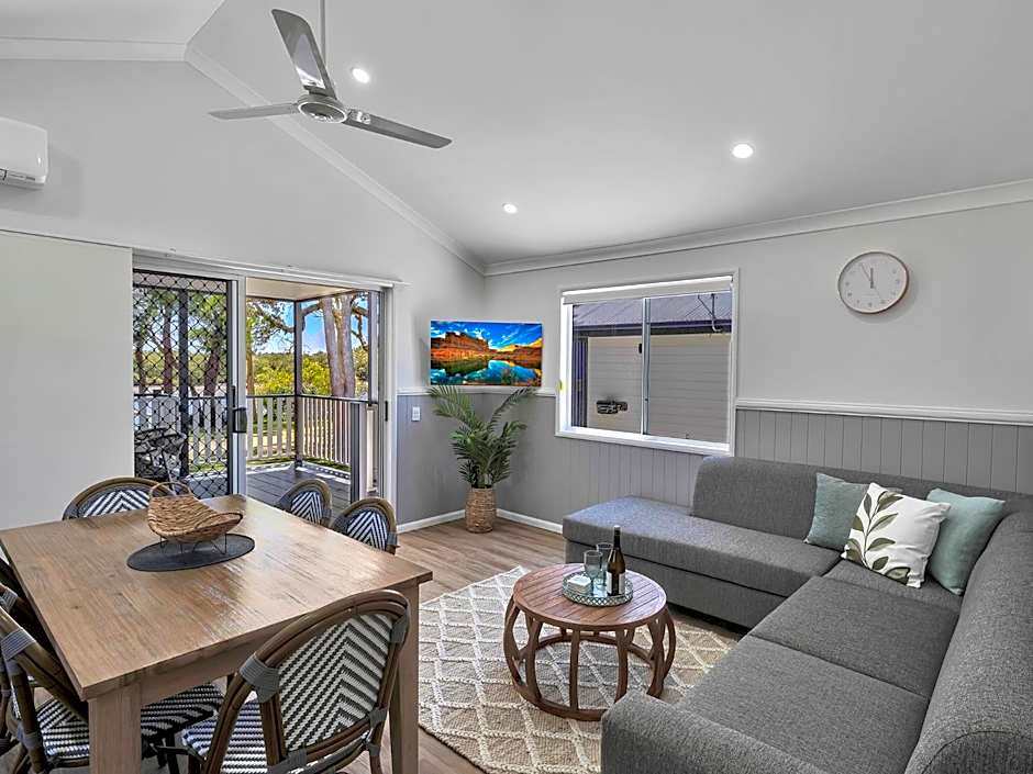 My two bedroom cabin is spacious with plenty of room to spread out and organise my general luggage and hiking gear. The kitchen is well equipped with a stove and large refrigerator. All the furnishings and facilities were comfortable and clean. The property is large with many sites and cabins but was pleasantly quiet, at least in the low season, and is located right beside a tranquil estuary. It's a pleasant 15 minute walk from the property to the beaches and commercial centre of South West Rocks.