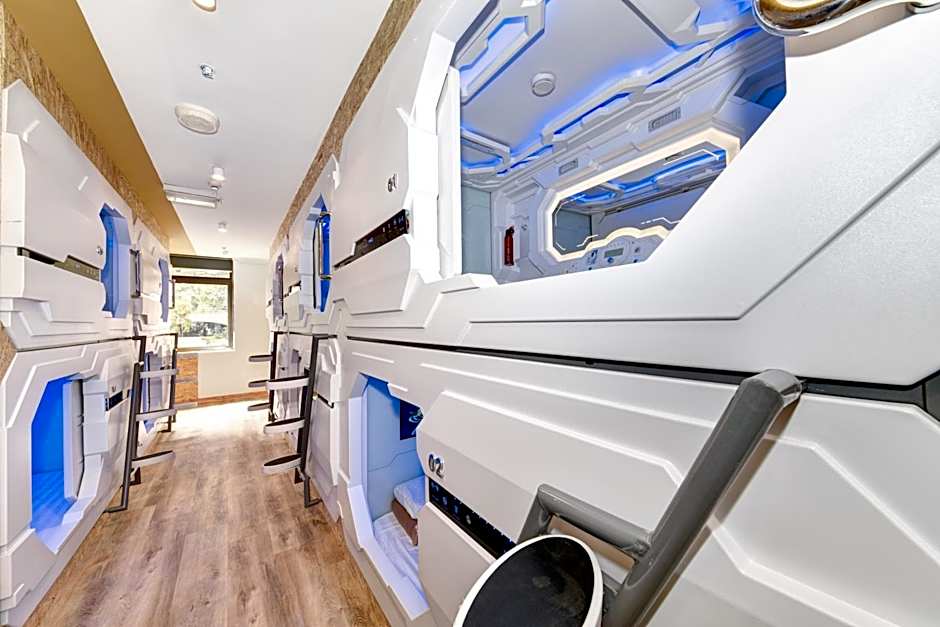 Inside, the experience centers on adults-only capsules with free Wifi, non-smoking rooms, a kitchenette, and views to enjoy during downtime.