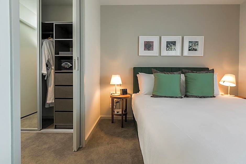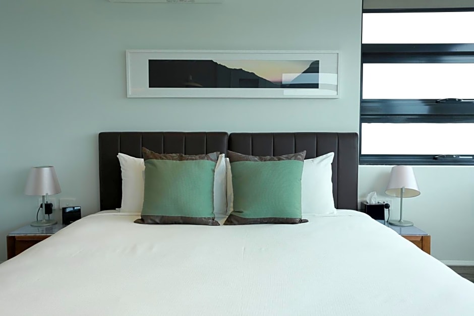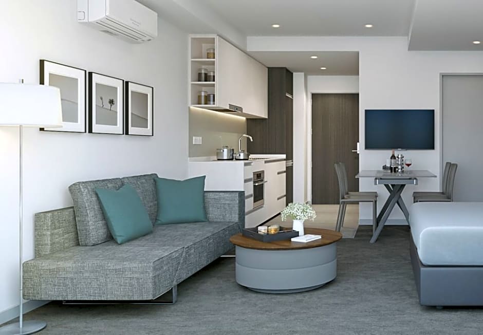 The spacious One-bedroom Bournemouth Suites feature a fully equipped kitchen with stove and microwave/oven, separate dining area for 6 (extendable to 8), a living area with a 3-seater sofa, coffee table and separate armchair. They also include an bedroom with attached bathroom with a King Bed (can be split to twins upon request) and a 3rd guest can be accommodated on a roll-away bed, available upon request and at an additional charge. Also featured are full-height windows with private balcony, key card access, reverse cycle heating/cooling, complimentary WiFi, washing machine and dryer, in-room safety deposit box, digital concierge, IP TVs and movies on demand at an extra charge.