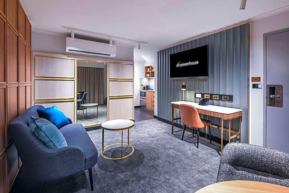 This suite has a separate bedroom with marble bedside tables, a wireless phone charger and a 60" 4K Smart TV. The open-plan lounge and dining area has a desk, USB charging ports an a 60" 4K Smart TV. The marble bathroom has a walk-in shower. Facilities include a mini-bar, noiseless ceiling fans, a coffee machine and air conditioning.
