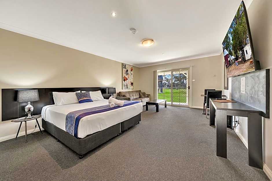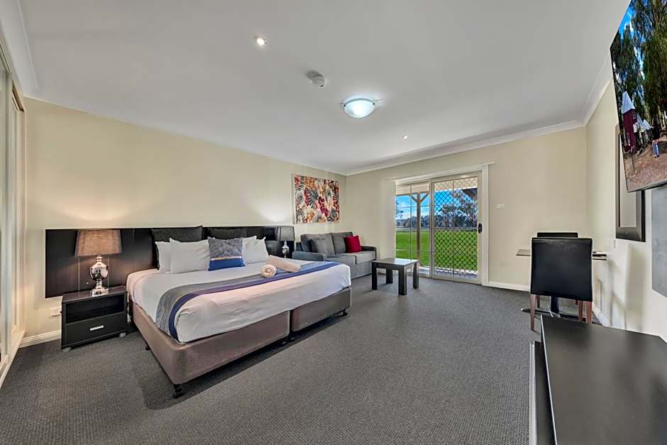 This is a large modern room with a luxurious King size bed, ensuite with spa bath, twin vanity basins and a separate shower. There are tea and coffee making facilities and a microwave as well as a bar fridge. Large flat screen 75" TV. Enjoy relaxing country views from the veranda. Access to the outdoor pool, restaurant and kids playground on the propertyAmple parking for all vehicles including floats and trailers.