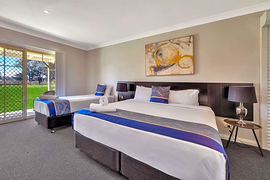 Large modern room with twin King size beds, ensuite with shower. The are with tea and coffee making facilities includes a microwave. In room ironing, bar fridge. Flat screen 75" TV. Enjoy relaxing country views from the veranda. Access to the outdoor pool, restaurant and kids playground on the property. Ample parking for all vehicles including floats and trailers.