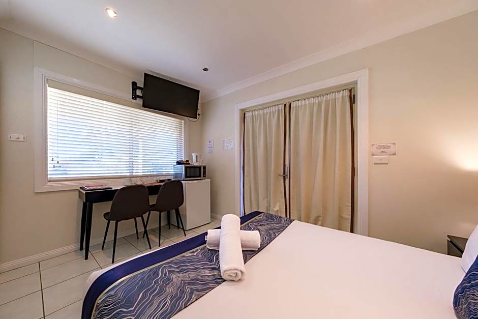 This large modern room has a King size bed and an ensuite with full disabled features including handrails and folding seat in the shower. The wheelchair access is from the parking lot. There are tea and coffee making facilities including a microwave. A bar fridge. Flat screen 75" TV. Enjoy relaxing country views from the veranda. Access to the outdoor pool, restaurant and kids playground on the property. Ample parking for all vehicles including floats and trailers.
