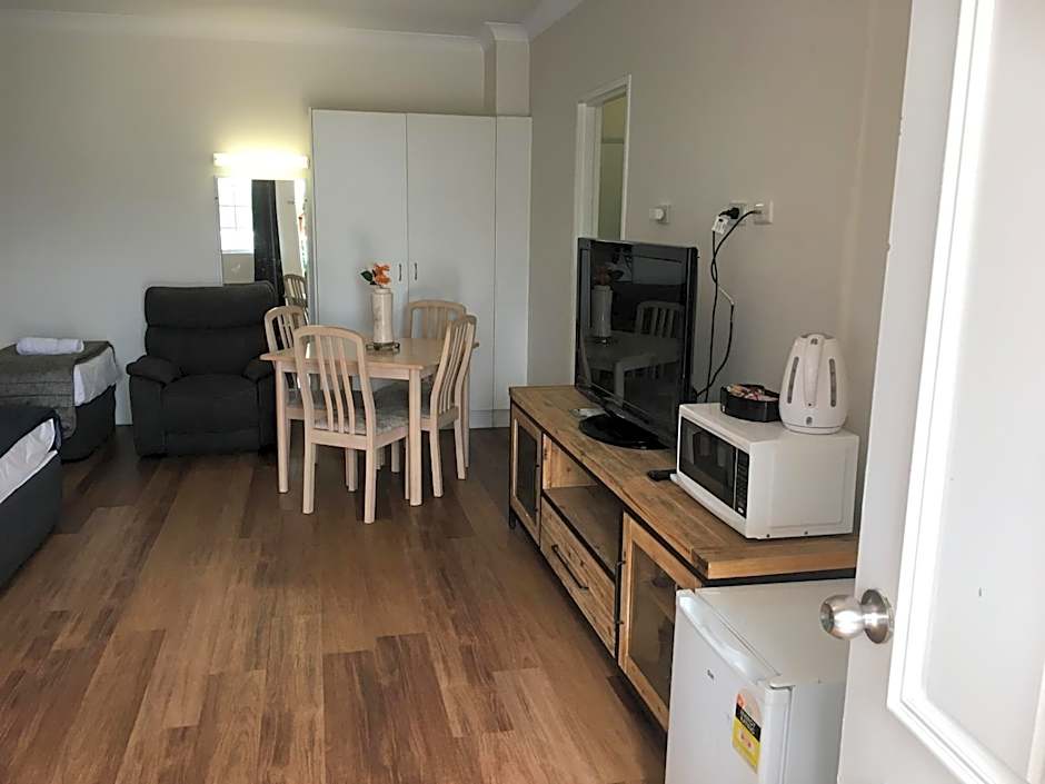 This comfortable room has a north-facing aspect and offers a kitchenette with a toaster, kitchenware, a microwave, bar fridge and tea and coffee making facilities. It features ironing facilities, air-conditioning, and a flat-screen TV.