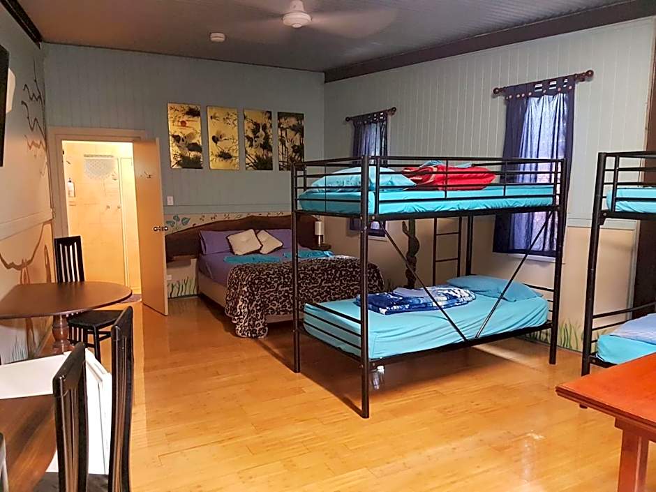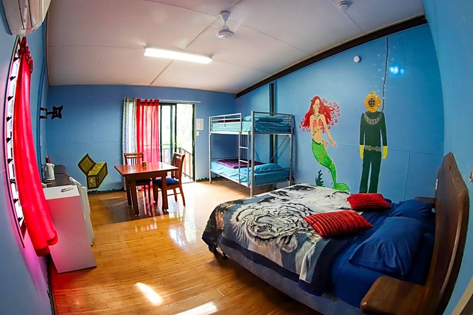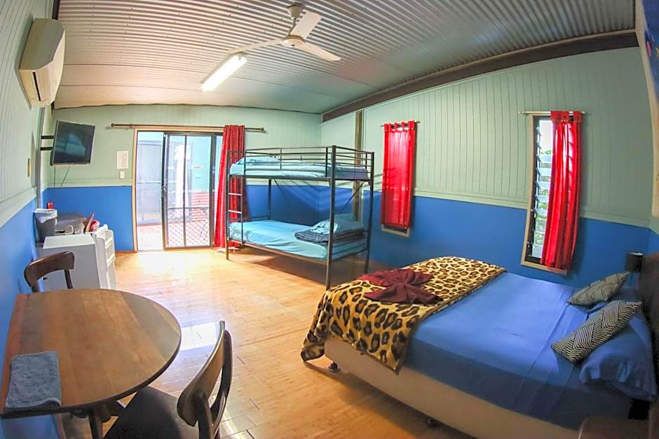 This family room features a hot and cold shower, fan, tea and coffee facility, small table setting and free entry to the butterfly house, pet garden and swimming pool area.