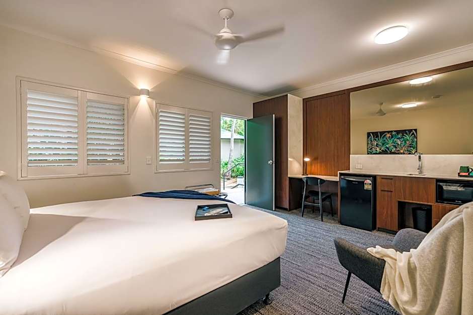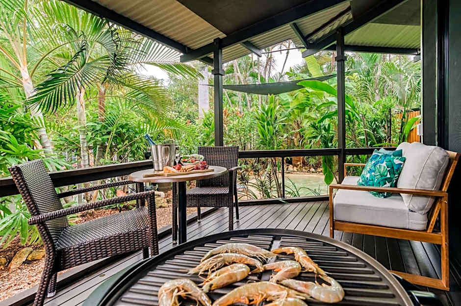 This villa is nestled within the tropical gardens of the resort with the wooden decks facing towards the Esplanade parkland. The villa features wooden decks with a table, chairs and electric BBQ. Complete with glass sliding doors and louvers they allow for true tropical living. Sheer and block out curtains provide natural light during the day and privacy when required.