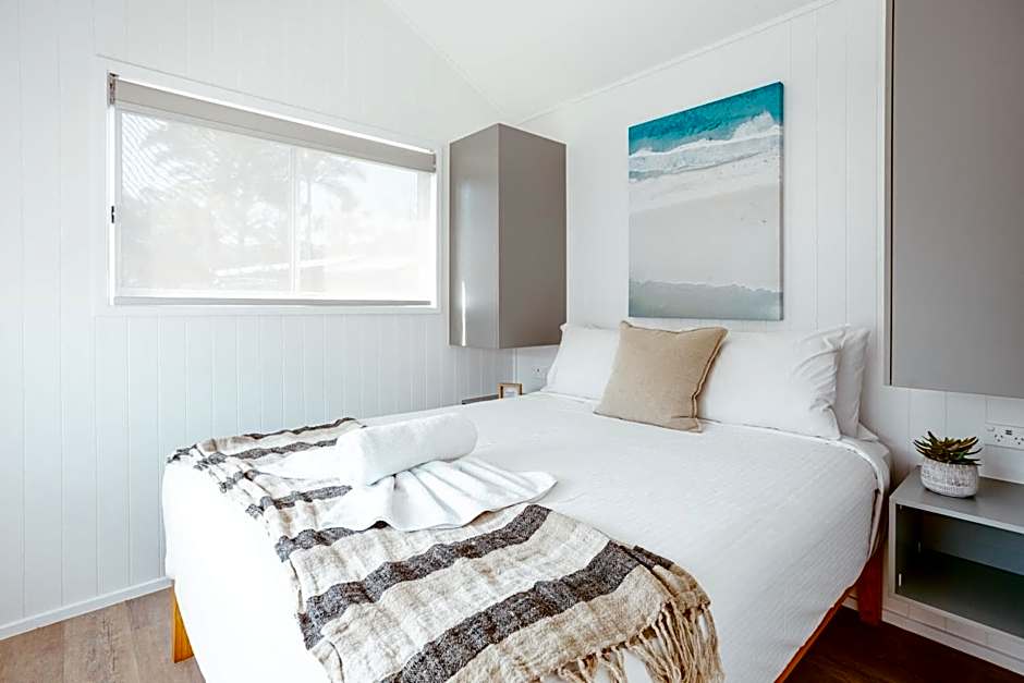 Free-standing cabin with a kitchenette, refrigerator, air-conditioning, table and chairs and undercover parking. Shared bathroom amenities. Linens are provided.