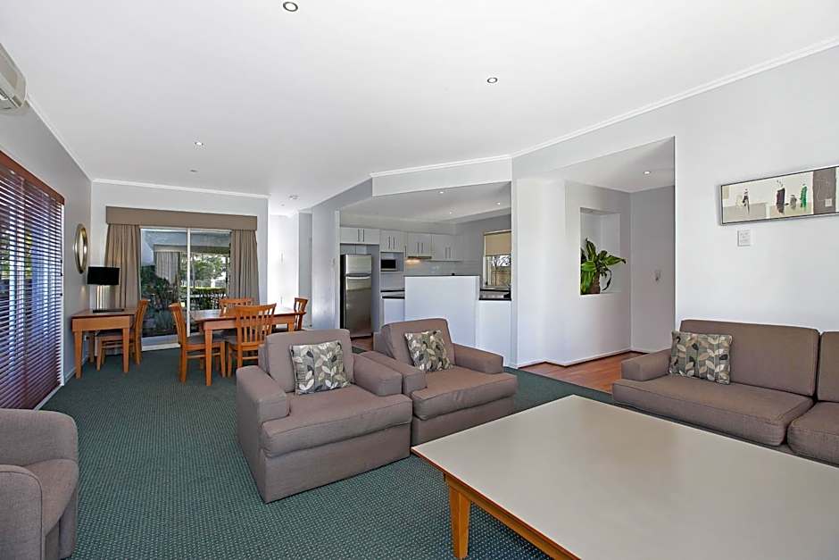 This huge two-level villa features a full kitchen with stovetop, oven, microwave and large fridge. There is a spacious lounge room, dining area and laundry as well as a flat screen TV with satellite channels, tea/coffee making facilities, work desk, iron and ironing board. There is an additional TV in the bedroom. The villa has three bedrooms, a large bathroom plus an en suite.