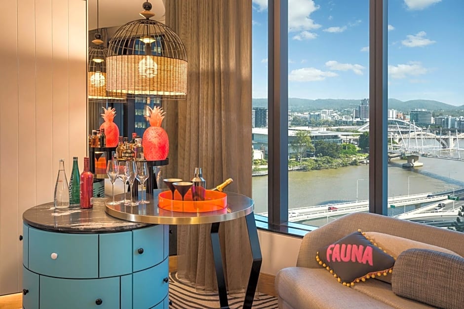 This luxurious suite features a separate living room and wall-to-wall windows, showcasing panoramic views over the Brisbane River. It includes custom-designed furnishings and interiors inspired by Australia and W Brisbane’s design narrative – ‘A River Dreaming’. Also provided in the room is the latest in technology, enhanced W MixBar, work desk and deep bathtub with a TV screen for relaxation.
