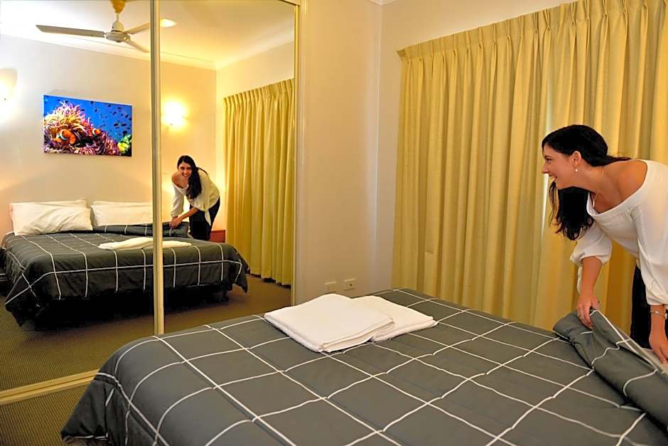 Value for money is the winner here! Property manager were friendly and welcoming and whole booking and stay was stress free. 2 bdr apartment was spacious and clean with everything we needed for 2 adults and 2 teenagers. Top floor views were great with a nice balcony. Lush tropical gardens and nice pool. Although pool was warm due to no shade but to be expected this time of year in the tropics (Dec). We wouldn't hesitate to book again. Stair access only for above ground floor. Not a problem for us but if there is mobility issues would need to ask for a ground floor apartment.