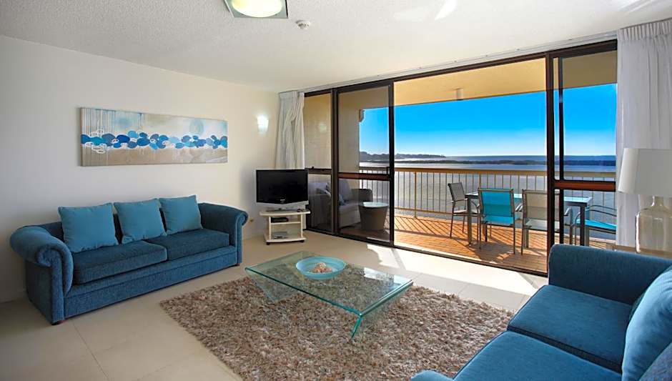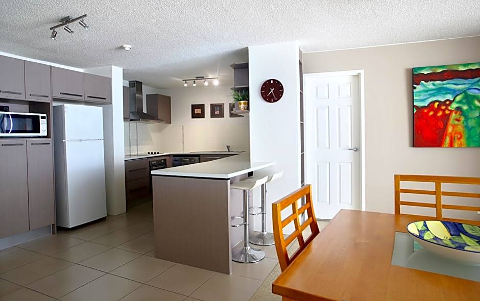 The 1-Bedroom Ocean View Apartments are located between the 2nd floor and 10th floor.These apartments feature a balcony offering beautiful views overlooking the Pumicestone Passage across to Bribie Island and out to the ocean. They offer a fully equipped kitchen, a dining area and laundry facilities. The lounge area offers a TV with free in-house movies and a DVD player.