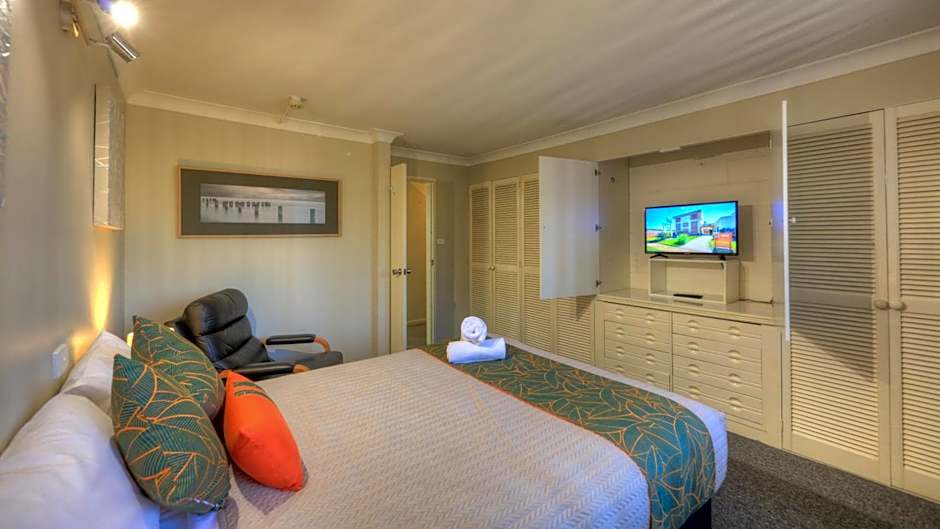 This Budget 2 Room only unit offers 1 queen bed in one room with tea and coffee making, bar fridge and a flat screen tv, the second bedroom has 2 single beds, flat screen tv and a desk. This unit offers a private bathroom. A very basic "no frills" unit. All rooms of this type are upstairs one flight.