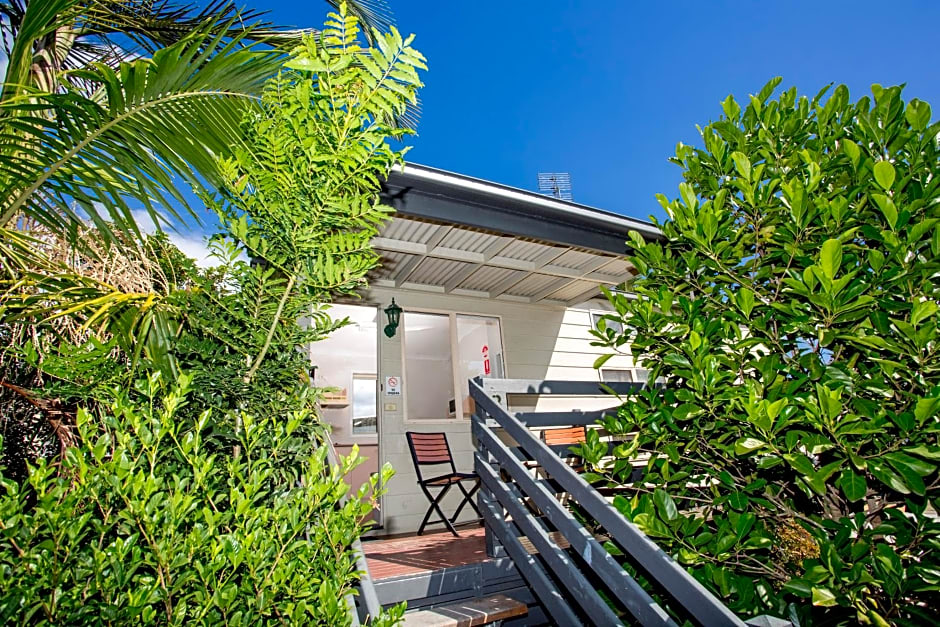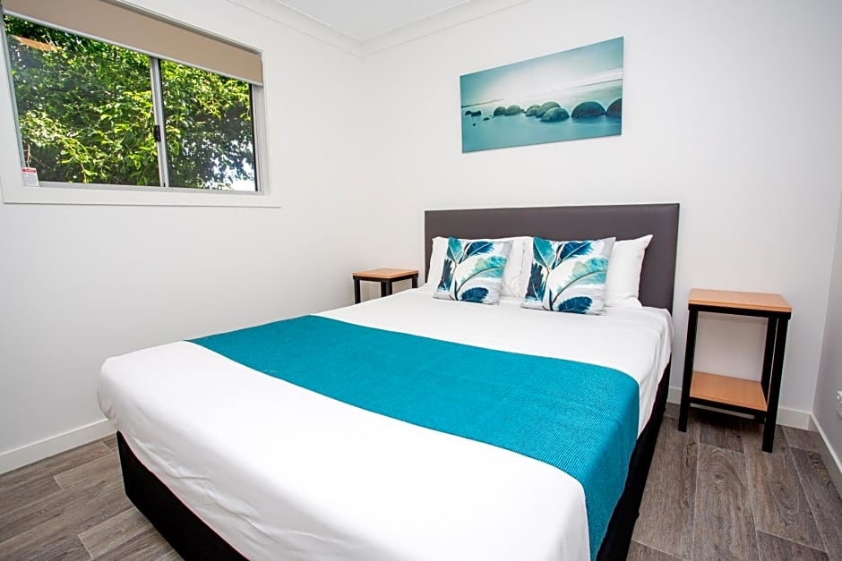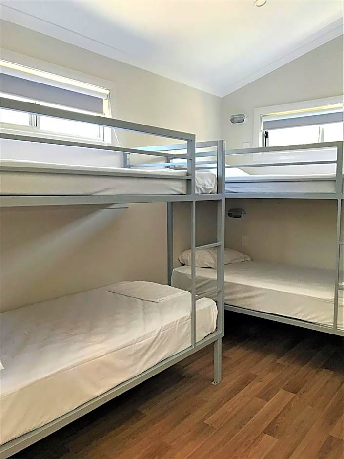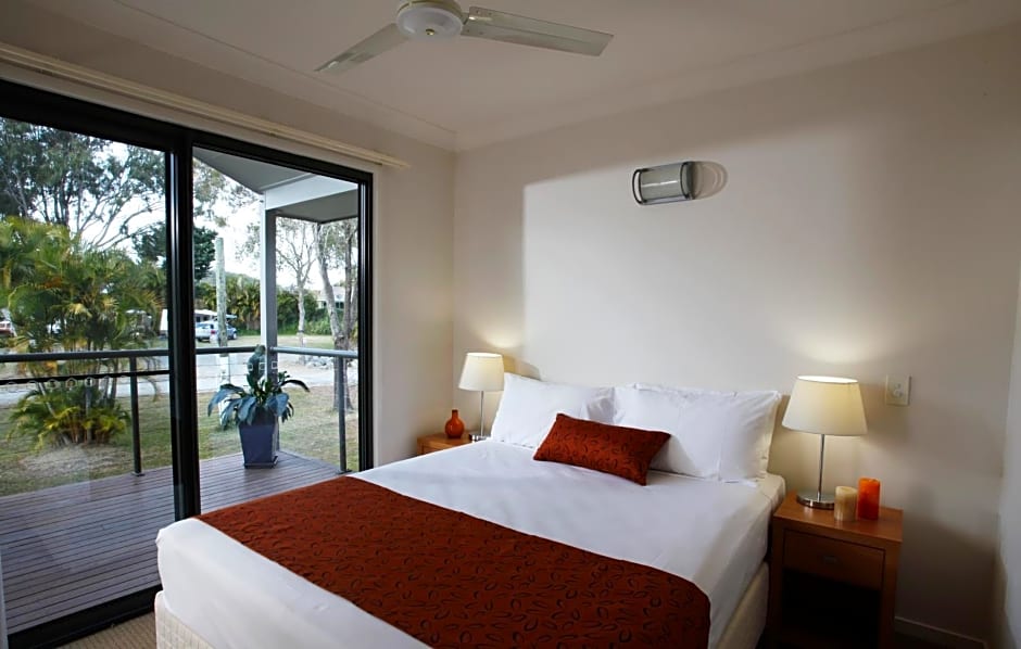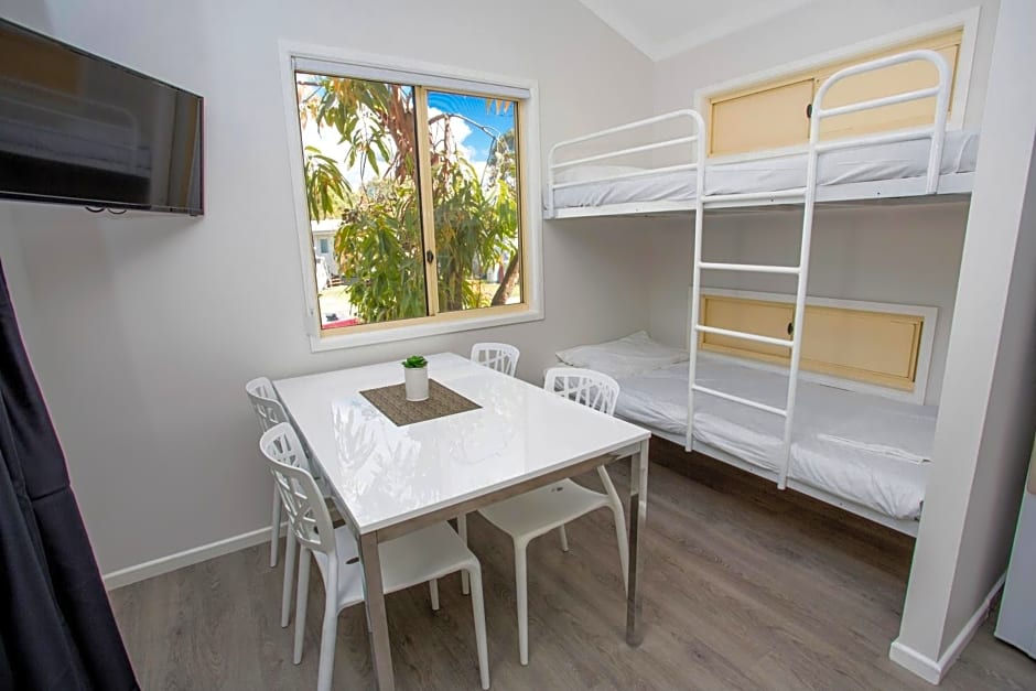 These compact, open-plan cabins feature a generous verandah to relax on and minimalist designed interior. The cabins are a peaceful retreat to enjoy your Gold Coast holiday experience, yet only a minute away from the BMX track and 32 acres of wide open spaces for the children to run around, a game of cricket or to enjoy a family picnic. Please note that dog-friendly options are available for this room type. These cabins cannot accommodate porta cots.