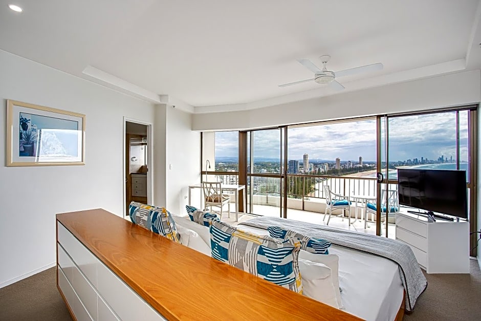2 & ½ bedroom hinterland view Superior Family Penthouse Apartment. Extremely spacious, Roof top 2 bedroom + single studio room superior penthouse apartment with stunning hinterland views and ocean glimpses. Views of the National Park. Perfect for the traveler looking for peace, tranquility and relaxation. Listen to the sounds of the local birds and enjoy this quiet part of Burleigh Heads. Features top quality appliances and furnishings. Queen bed in the main bedroom and private bathroom. Two singles in the second bedroom plus a single bed studio room. It has a second bathroom allowing privacy and comfort. Air-conditioning throughout, DVD, Plasma TV, Digital Foxtel, free security parking. A truly calm and soothing holiday experience. Note: All apartments are individually owned so some furnishings may vary between apartments.