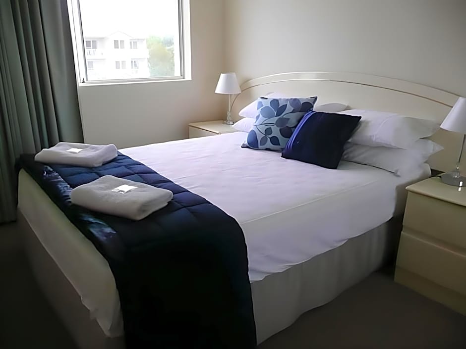 Comfortable 2 bedroom apartment with nice views across the river. Close to Broadwater 'beach', bus stop immediately outside. Good air con, fans in bedrooms. Comfortable beds. Well stocked kitchen. Nice outdoor area with two pools and barbeques