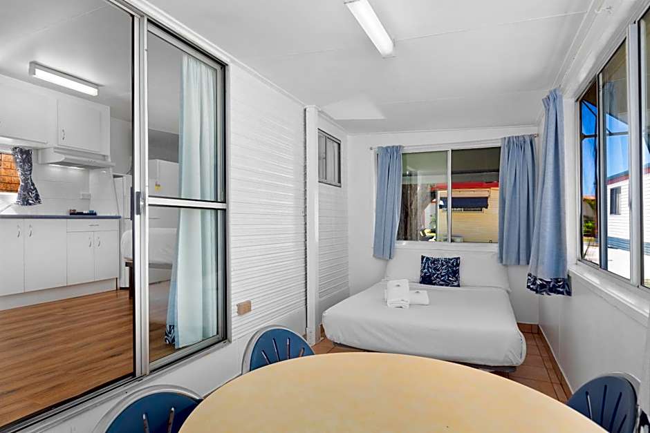 Room was super clean and our ensuite even though it was quite old and dated, it was very clean. Basic facilities in room , hot plate and pots and pans. Enough for us to make a breakfast and head out for the day. We would head out all day and only really used the cabin to sleep in so the small size was not an issue for the 2 of us. There was a pool that appeared clean but we didn't use as it was winter anyway. The ensuite is outside the cabin just a few steps away which was not an issue for us. This park served our purpose of affordable accomodation to sleep in while we boated on the river every day all day. Recommended