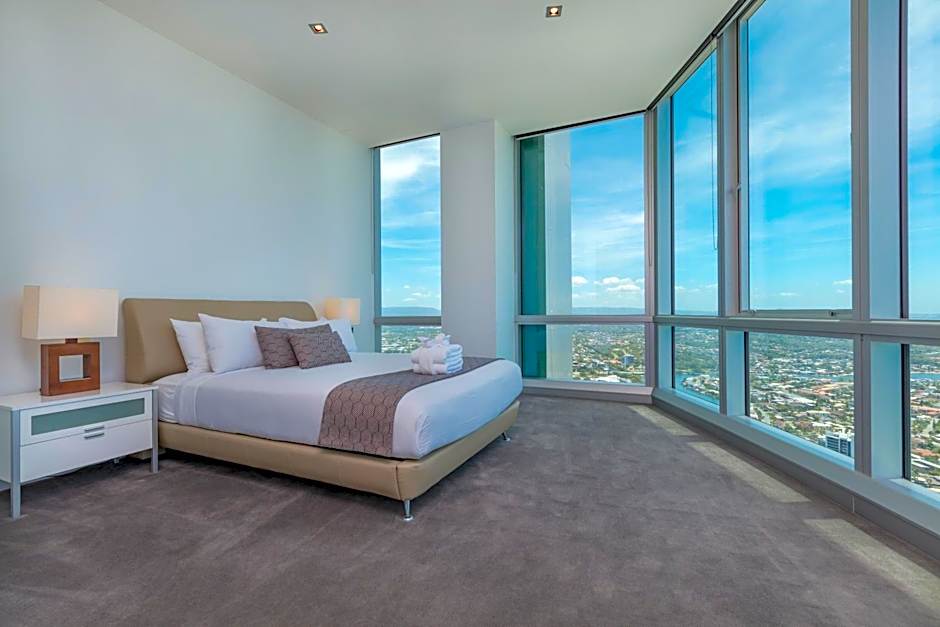 Located from level 70 of the Q1 Resort & Spa, our 4-Bedroom Penthouse Apartments offers 400+ square yards of living space. Featured is a designer kitchen with gas appliances, dishwasher, multiple dining areas and large living spaces. It includes 2 grand master bedrooms both with private private bathrooms, one of which includes a spa bath. Another main bathroom with its own spa bath and an additional separate powder room are also included. Complete laundry facilities with washing machine and dryer are also available. The Penthouse features 2 unique glass enclosed balconies with breathtaking views of the Pacific Ocean, Surfers Paradise, Broadbeach, Gold Coast waterways and Hinterland. This room includes a 25% discount for SkyPoint Climb.