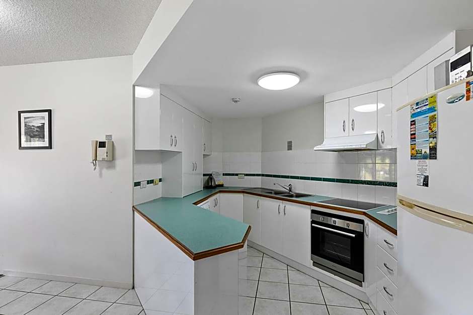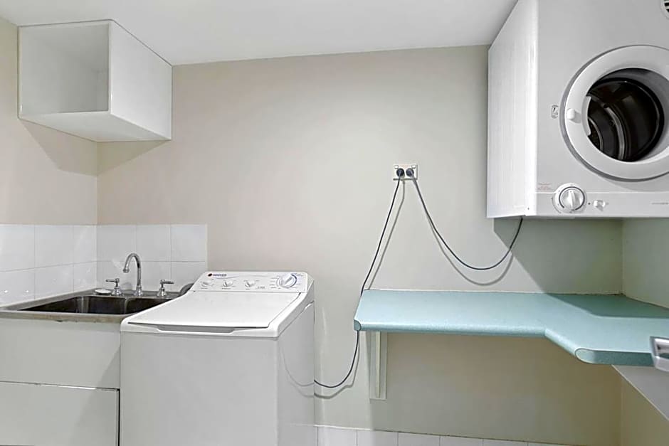This apartment features a private balcony with partial views of the bay. It also has full kitchen and laundry facilities.