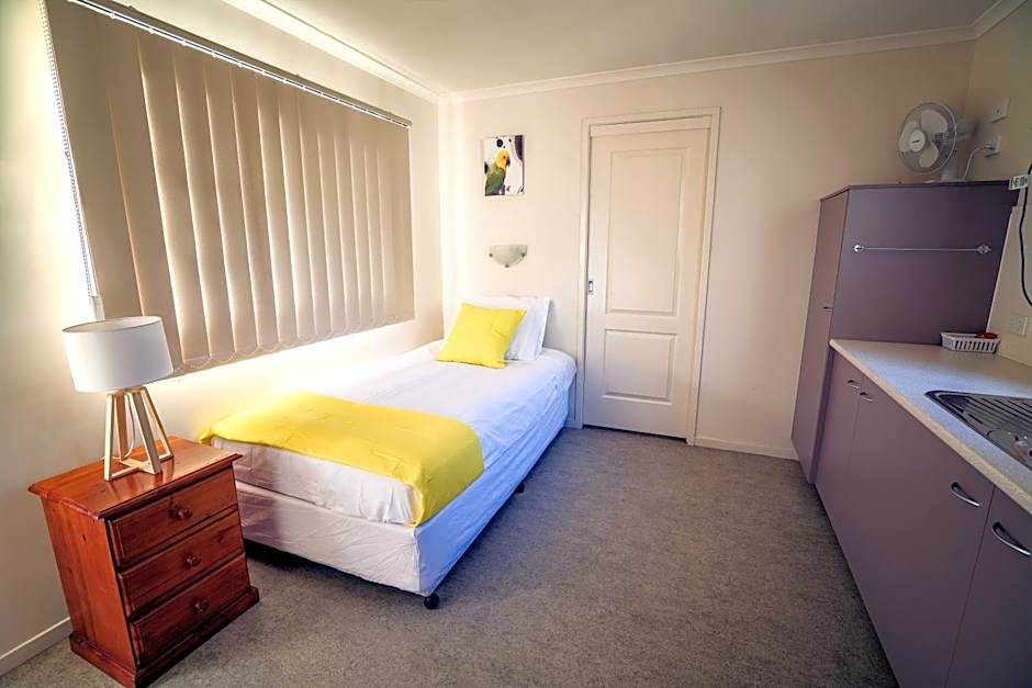 This room has a private entrance, a king-single bed, a kitchenette and an private bathroom.