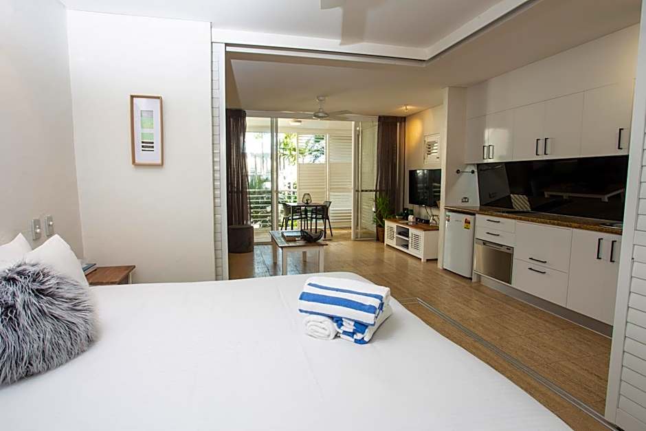 The Oasis Penthouse Suite is in a small enclave consisting of 12 units. The Penthouse features a king size bed, bathroom with laundry facilities, open plan living area including kitchenette with dishwasher, refrigerator & tea/coffee making facilities, and a private balcony with rooftop spa and BBQ. Oasis Penthouse Suites offer pool views and include an in-room spa bath..