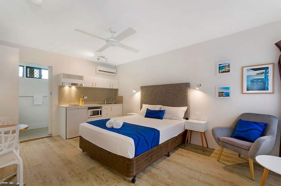 This fully renovated self-contained twin studio has a comfortable queen and single bed, 50-inch Netflix TV, fully equipped kitchenette with 2 burner hotplate, free WiFi, satellite sport channels and modern decor.