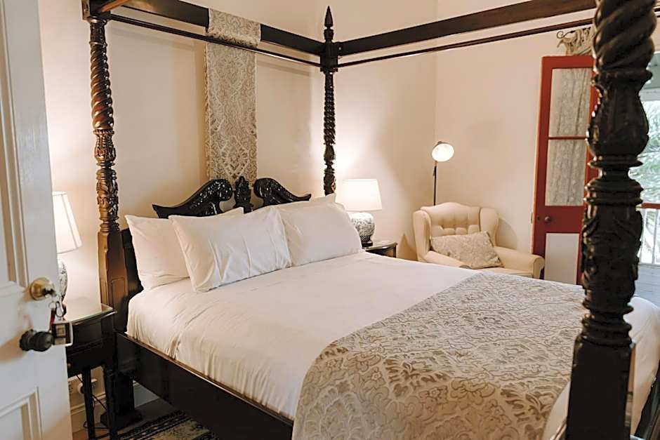 This spacious, air-conditioned suite features a private patio veranda and an private bathroom with a claw-foot bathtub. It has a 4-poster mahogany bed with lacy curtains and a canopy. The adult only suite features stained glass windows, chandeliers, an electric fire place, high vaulted wood ceilings, large day bed, TV and DVD player.