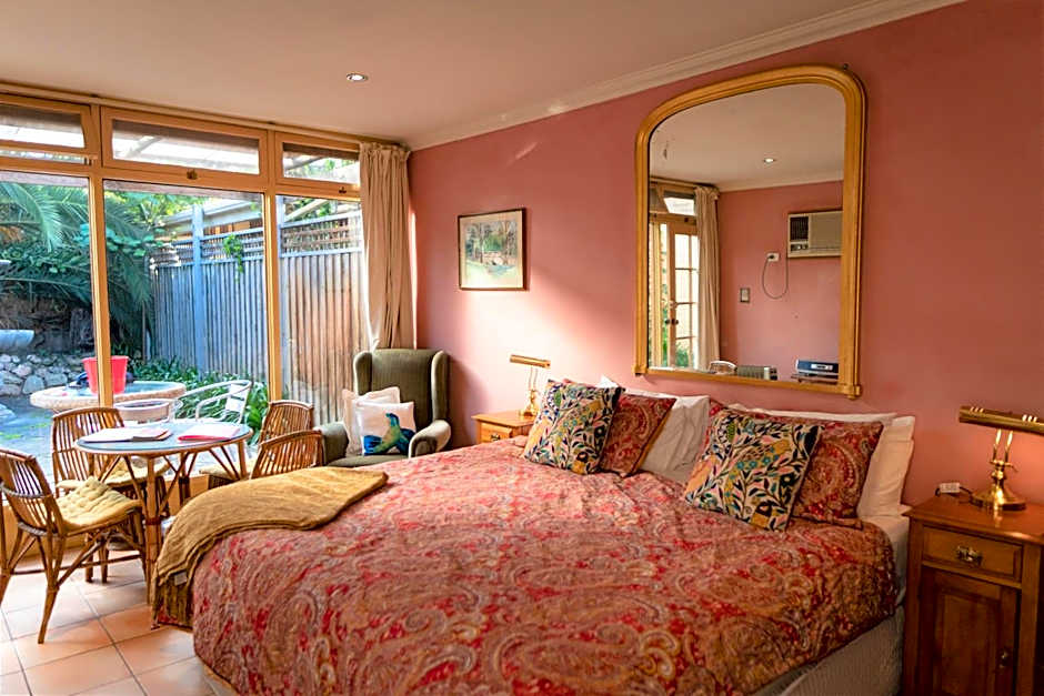 The Champagne Garden Suite is a beautiful self-contained suite, featuring a galley kitchenette and a large bathroom with a spa bath. It also includes air-conditioning, underfloor heating and beautiful Australian art and antiques. It overlooks the private courtyards, which has cane outdoor furniture. 4 arm chairs and on-street parking are available.
