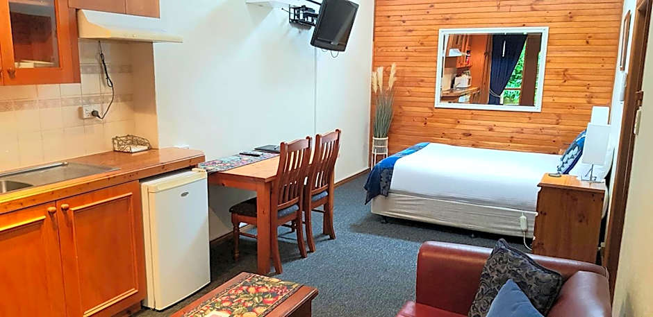 Clarendon Chalets offers a private entrance that opens onto a sunlit patio with a garden view, delivering a discreet retreat after days of exploring Mount Gambier. A kitchen setup with kitchenware and a kitchenette makes self-catering straightforward, while a barbecue and the outdoor setting invite relaxed meals and evenings under the trees.