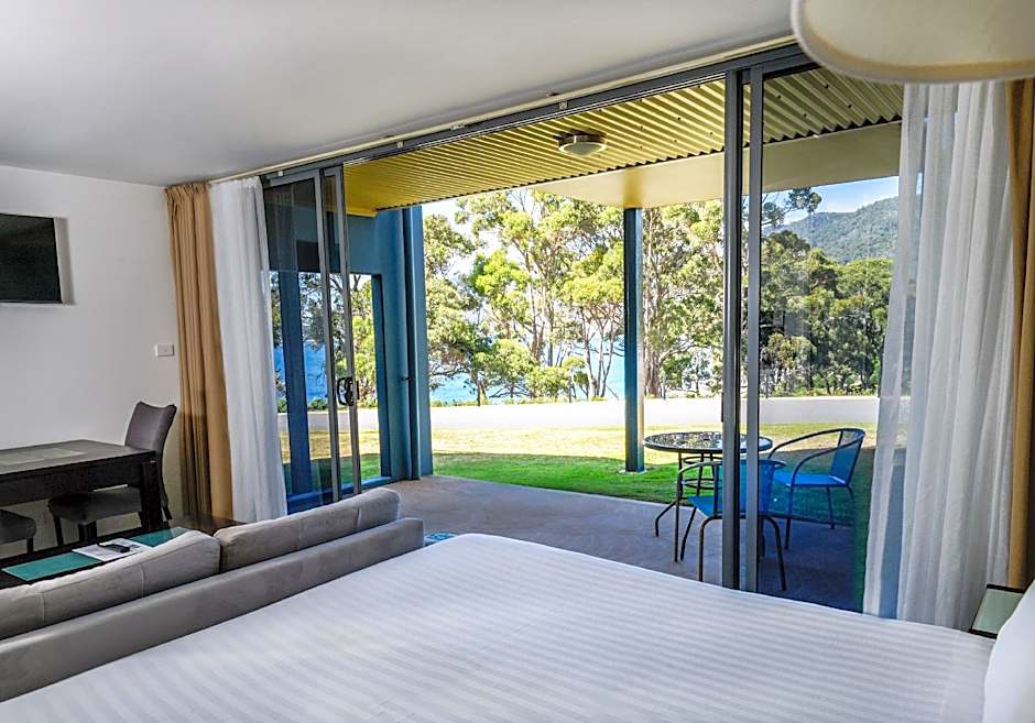 Elevate your stay in a Superior Queen Room with views of Pirates Bay. This room offers an unparalleled experience, featuring sweeping views that stretch across the stunning landscape. This well-appointed room offers a queen-sized bed, an ensuite with walk-in shower, a television and tea and coffee making facilities. The room features a large window that frame the exceptional views of Pirate’s Bay. Enjoy complimentary Wi-Fi and parking, ensuring a seamless and delightful experience throughout your visit.