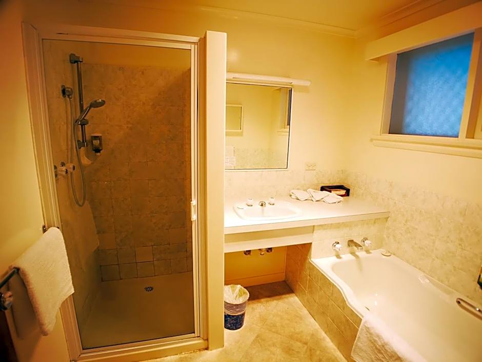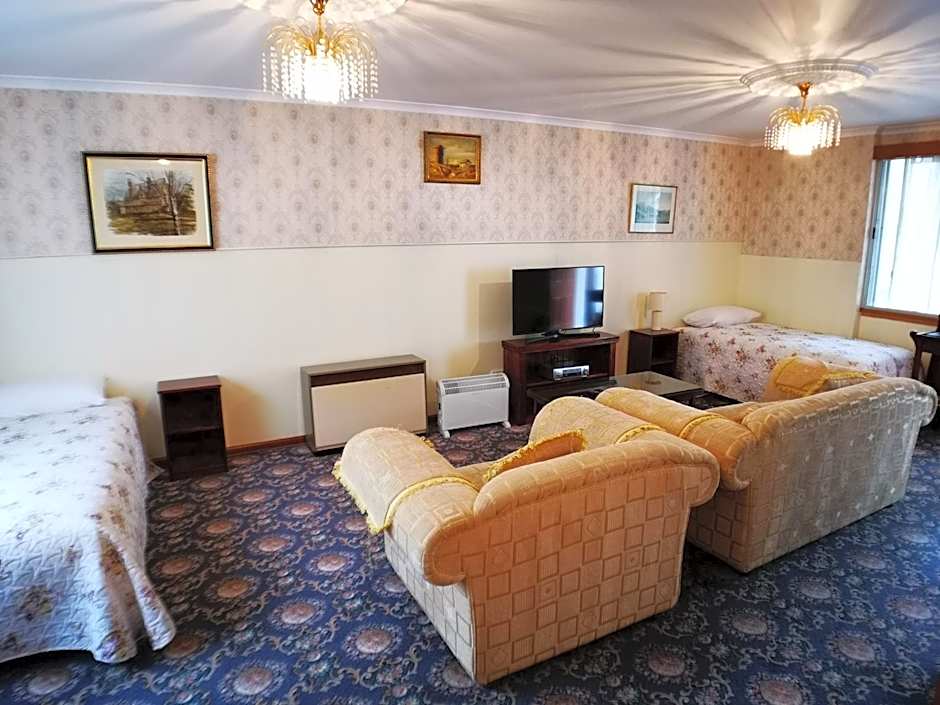This spacious 1-bedroom family room has 1 queen-sized bed, 2 single-sized beds, a lounge area and a bathroom with a spa bath and a shower. There is a kettle, refrigerator, toaster, microwave and tea/coffee making facilities.