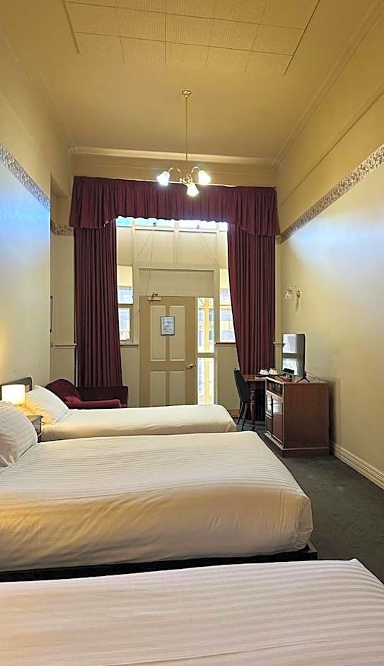 One of the largest rooms in the hotel, complete with 13 ft high ceilings, a sitting area, private bathroom and wardrobe. This room has windows which face into a light filled hall and are fitted with block out curtains for privacy. Bed configuration is 1 x Queen, 2 x Single beds, perfect for families for a group of friends. This room is a ground floor room.