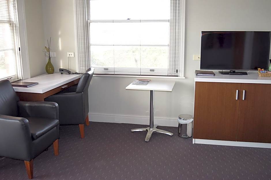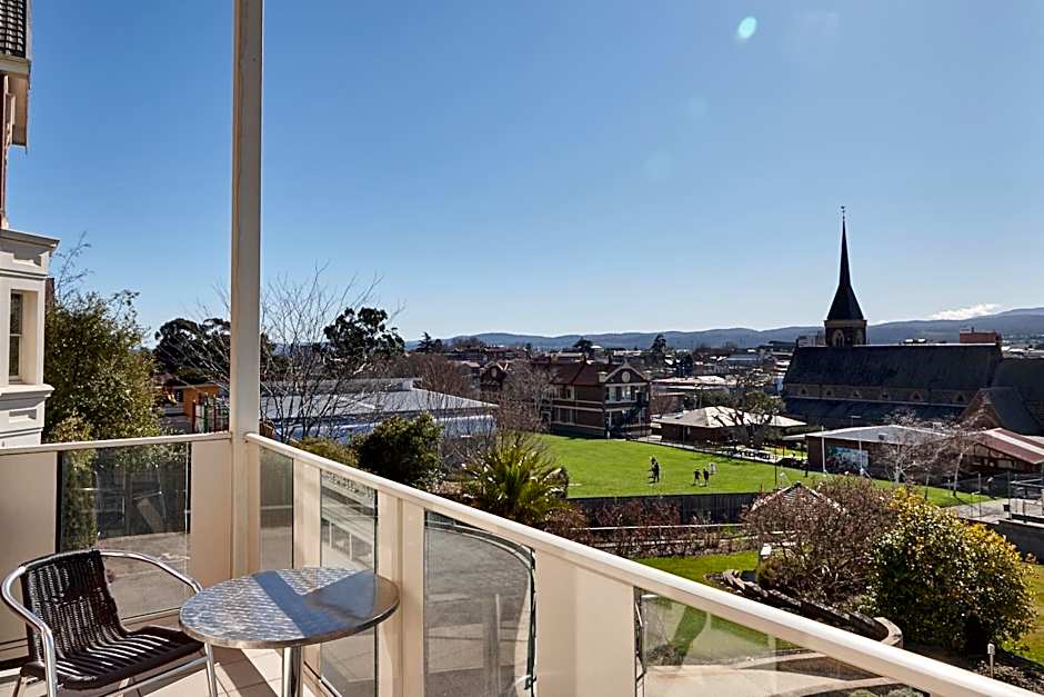 This spacious 1-bedroom suite has a king-sized bed and a private private bathroom with a shower and a separate deep, deluxe, 2-person bath. It also includes wardrobes, bath robes, ironing facilities, a 50-inch 4K TV, a Blu-ray player, a mini-bar, crockery/cutlery and a breakfast table with leather club chairs. There is an adjoining, spacious living/dining room with a leather sofa, a queen-sized bed, a 55-inch LCD TV, Blu-ray player, a 6-person dining table and beautiful bay window views of the landscaped gardens, Central and East Launceston and the mountains beyond.