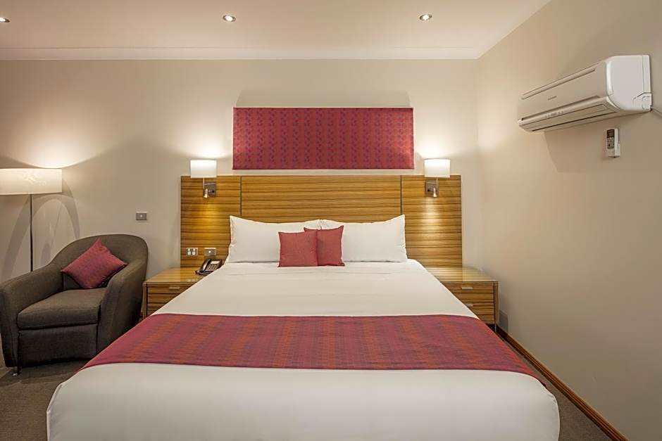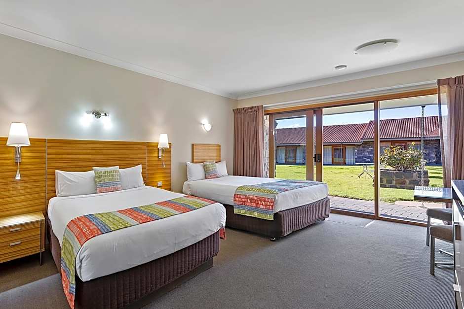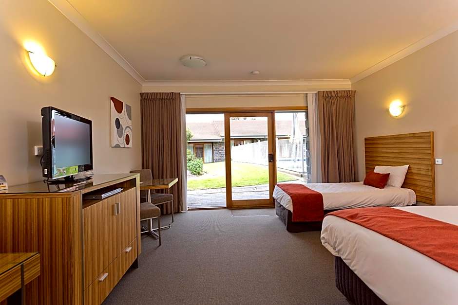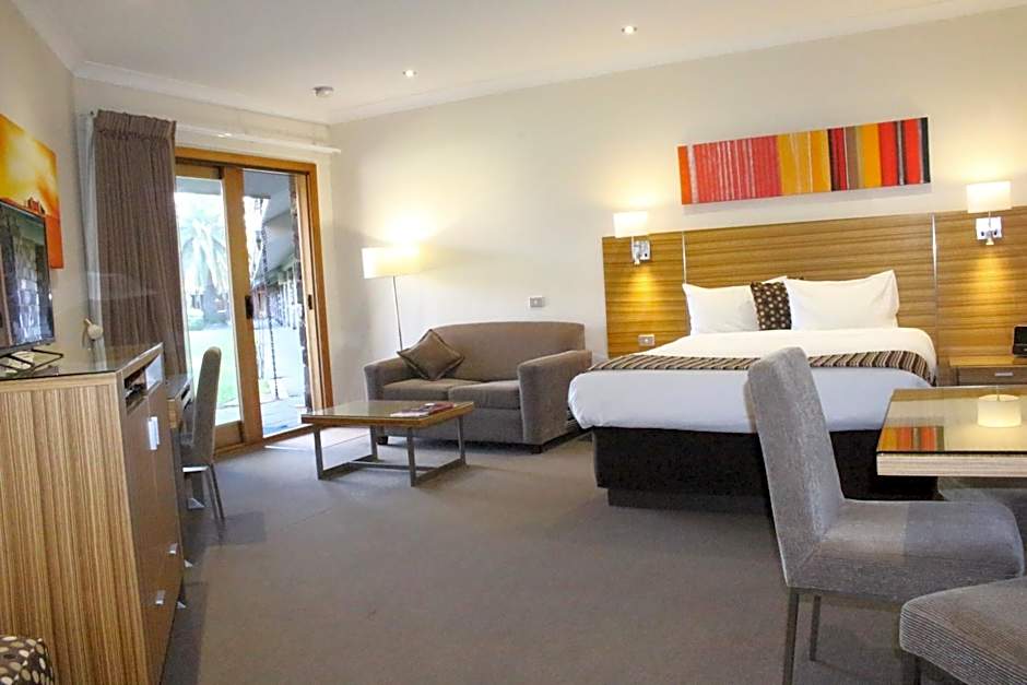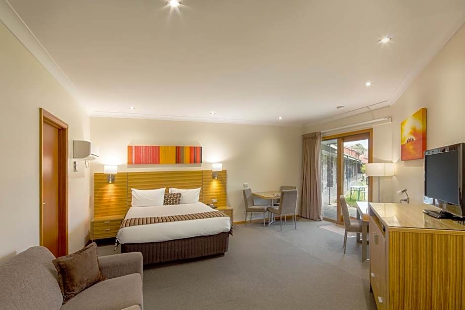 These spacious King rooms feature a lounge chair, 55-inch Smart TV, DVD player, table and chairs. The over-sized bathroom offers a walk-in shower and double vanity basin. You can enjoy complimentary WiFi and reserved car parking at your door. Also provided is a coffee pod machine. All rooms open out to the central courtyard gardens and swimming pool for your enjoyment.